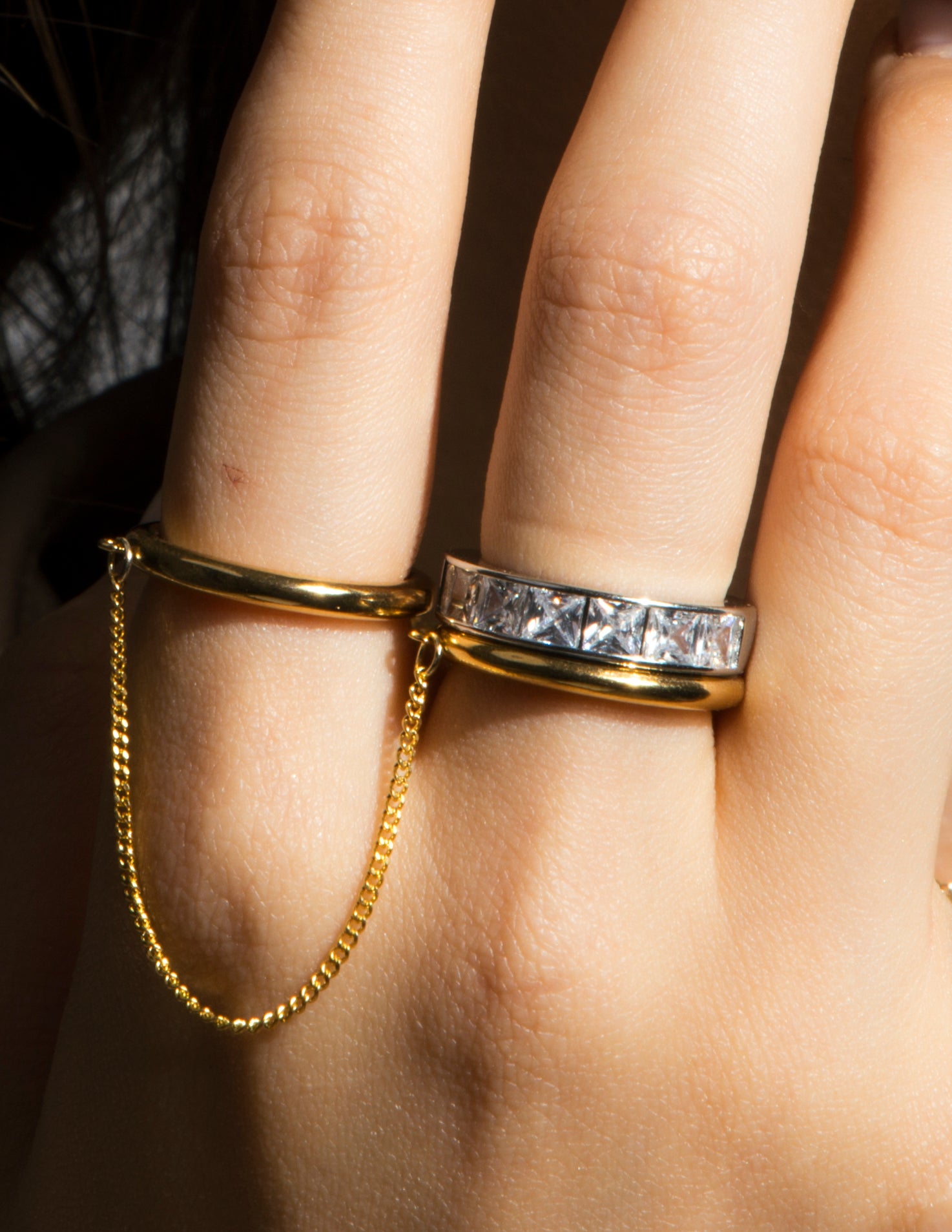 Two-tone elegance of silver and gold meets modern edge in this double ring design, linked by a fine chain and adorned with princess-cut zirconia — bold, balanced, and unforgettable.