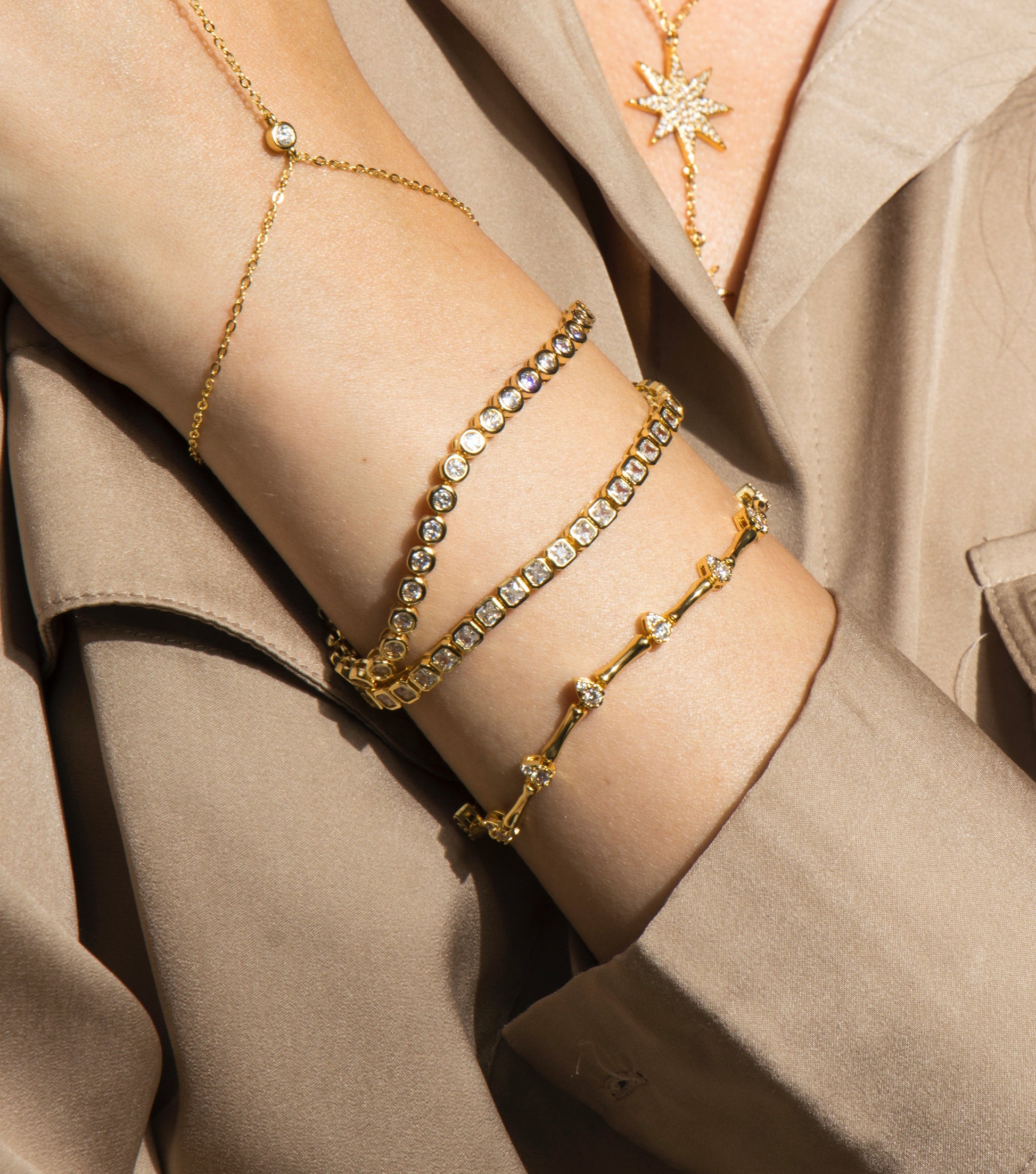 Crafted with 18k gold plating, this tennis bracelet features bezel-set round zirconia stones for a modern, clean finish. Designed to add a refined sparkle to both daywear and evening looks—effortlessly chic and endlessly versatile.