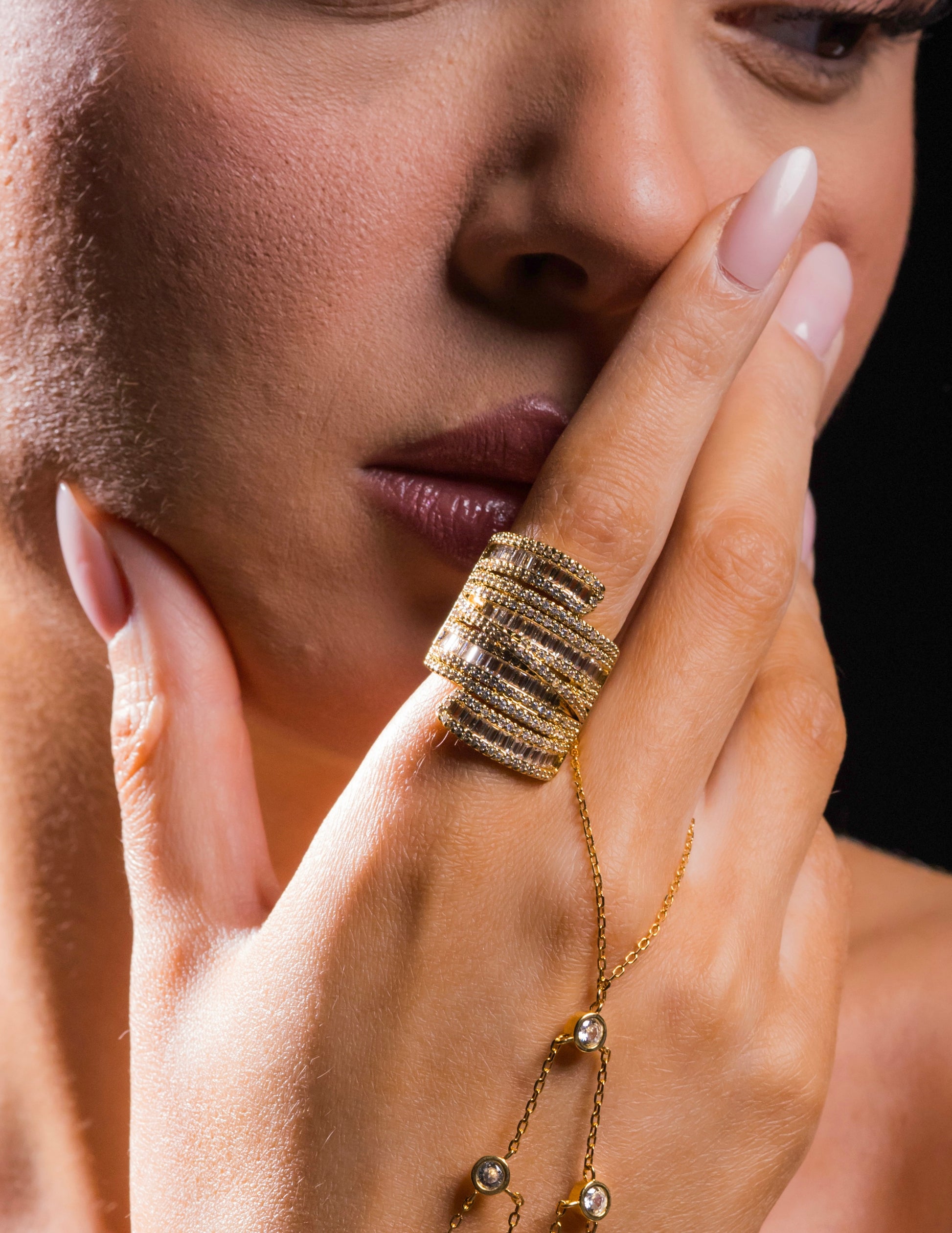 Multi-layered statement spiral ring with diamond effect CZ inlaid stones. Helps transform your whole hand into a piece of jewelry. Free size 18k gold plated ring on brass with zirconia stones.